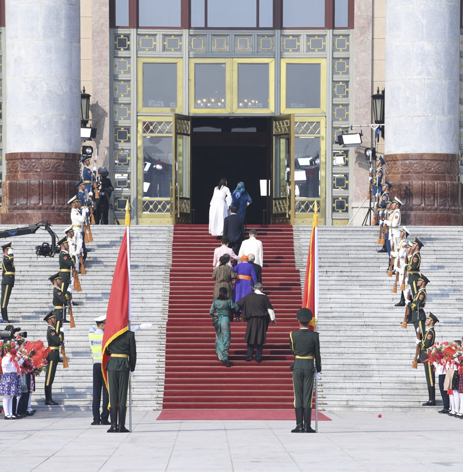 人民大會堂東門外,高擎紅旗的禮兵分列道路兩側(cè),肩槍禮兵在臺階上莊嚴佇立。車隊抵達時,早已迎候在這里的青少年們迸發(fā)出熱情的歡呼。