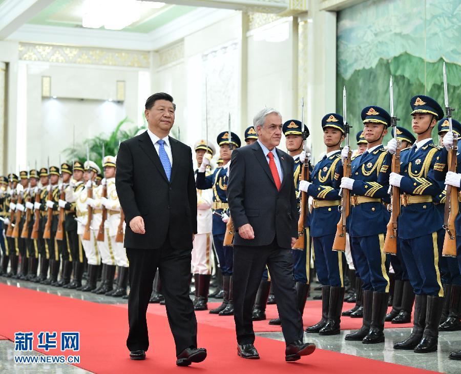 4月24日,國家主席習(xí)近平在北京人民大會堂同智利總統(tǒng)皮涅拉舉行會談。這是會談前,習(xí)近平在人民大會堂北大廳為皮涅拉舉行歡迎儀式。 新華社記者 饒愛民 攝