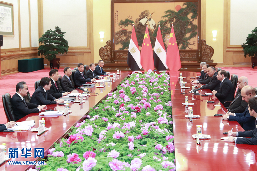 習(xí)近平強調(diào),埃及是非洲聯(lián)盟輪值主席國,總統(tǒng)先生來華出席第二屆“一帶一路”國際合作高峰論壇,不僅體現(xiàn)了埃及積極參與共建“一帶一路”的真誠意愿,也代表著非洲國家尋求互利共贏、實現(xiàn)共同發(fā)展的普遍呼聲。中方高度重視發(fā)展同埃及關(guān)系。雙方要深化政治互信,繼續(xù)在涉及彼此核心利益和重大關(guān)切問題上相互支持和配合。中方始終支持埃及探索符合本國國情的發(fā)展道路,愿積極參與蘇伊士運河走廊開發(fā)計劃,持續(xù)推進(jìn)蘇伊士經(jīng)貿(mào)合作區(qū)建設(shè)及產(chǎn)能、基礎(chǔ)設(shè)施建設(shè)等領(lǐng)域合作。中方還將在埃及設(shè)立“魯班工坊”,向埃及青年提供職業(yè)技能培訓(xùn)。雙方要深化反恐和安全合作,持續(xù)密切人文交流。中國感謝非洲人民對中國的信任,我們支持非洲和平安全與可持續(xù)發(fā)展倡議和非洲一體化進(jìn)程,愿同埃方加強對非三方合作,共同促進(jìn)非洲基礎(chǔ)設(shè)施建設(shè)。