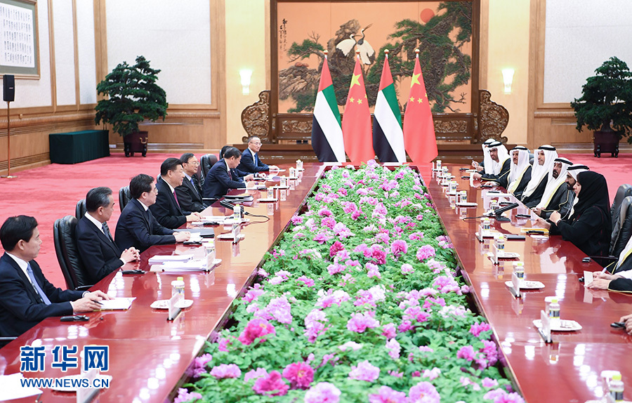 習近平指出,去年7月我訪問阿聯(lián)酋期間,兩國宣布建立全面戰(zhàn)略伙伴關(guān)系,揭開中阿關(guān)系發(fā)展新篇章。中方視阿聯(lián)酋為共建“一帶一路”的重要合作伙伴。雙方要穩(wěn)步推進以能源合作為主軸、以投資和基礎(chǔ)設施建設為兩翼、以高新技術(shù)為增長點的務實合作。下階段要對接創(chuàng)新發(fā)展戰(zhàn)略,打造兩國合作新增長點。要深化打擊恐怖主義和極端勢力等安全領(lǐng)域合作,共同維護兩國和地區(qū)安全穩(wěn)定。副總統(tǒng)先生提出的“擁抱中國”計劃深受阿聯(lián)酋民眾歡迎,要不懈推動兩國人文交流。中方支持阿方明年舉辦中東地區(qū)首屆世博會。