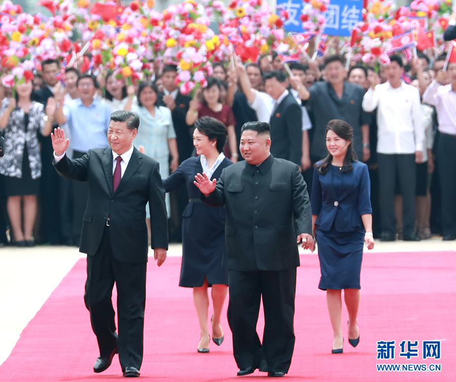 當?shù)貢r間12時許,習近平乘坐的專機抵達平壤順安機場。雨后初晴的平壤,天高云淡、氣候怡人,到處郁郁蔥蔥、繁花似錦,整個城市洋溢著友好熱烈的氣氛。機場上中朝兩國國旗迎風飄揚,“熱烈歡迎中國共產黨中央委員會總書記、中華人民共和國主席習近平同志”“鮮血凝成的朝中兩國人民之間牢不可破的友誼團結萬歲”大幅標語高高懸掛,近萬名群眾排列成整齊的隊伍,有力地揮動著花束,以歡快的口號和熱情的笑容,歡迎尊貴的中國客人到來。朝鮮勞動黨委員長、國務委員會委員長金正恩和夫人李雪主到機場迎接。