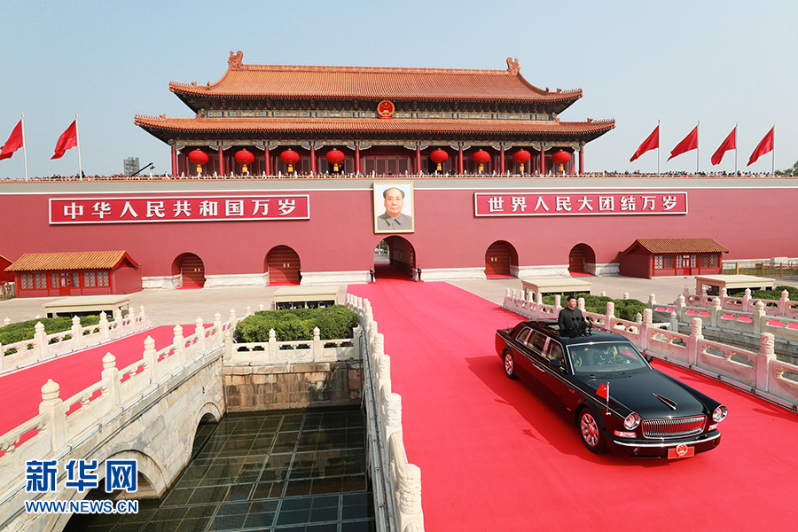 10月1日,慶祝中華人民共和國(guó)成立70周年大會(huì)在北京天安門(mén)廣場(chǎng)隆重舉行。中共中央總書(shū)記、國(guó)家主席、中央軍委主席習(xí)近平發(fā)表重要講話(huà)并檢閱受閱部隊(duì)。這是習(xí)近平乘坐檢閱車(chē),經(jīng)過(guò)金水橋,駛上長(zhǎng)安街。 新華社記者 龐興雷 攝