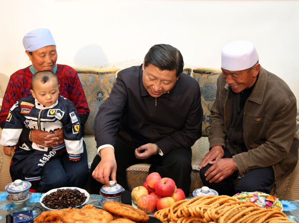 (2008年4月8日,習(xí)近平在固原市原州區(qū)開城鎮(zhèn)深溝村考察新農(nóng)村建設(shè)情況時(shí)看望回族農(nóng)民金學(xué)文一家,并在農(nóng)民家品嘗當(dāng)?shù)氐纳w碗茶。新華社記者蘭紅光攝)