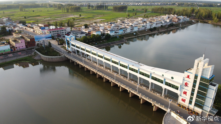 這是2020年8月15日拍攝的位于安徽省阜南縣的王家壩閘(無人機照片)。新華社記者 張端 攝