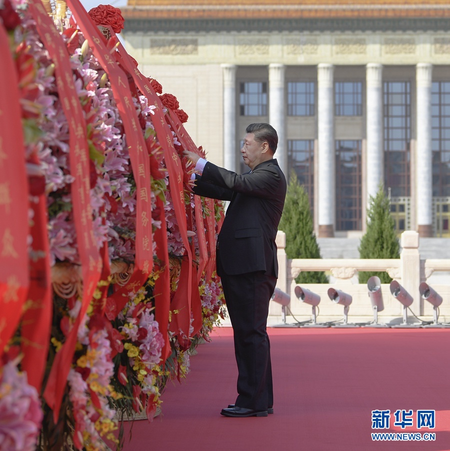 9月30日上午,黨和國家領(lǐng)導人習近平、李克強、栗戰(zhàn)書、汪洋、王滬寧、趙樂際、韓正、王岐山等來到北京天安門廣場,出席烈士紀念日向人民英雄敬獻花籃儀式。這是習近平整理花籃上的緞帶。 新華社記者 申宏 攝