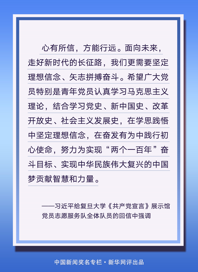心有所信,方能行遠(yuǎn)。今天,歷史的接力棒傳到了我們手中。面向未來(lái),走好新時(shí)代的長(zhǎng)征路,我們更需要堅(jiān)定理想信念、矢志拼搏奮斗,不斷創(chuàng)造新精彩,續(xù)寫新榮光。 (文字:徐可 海報(bào):張倩)