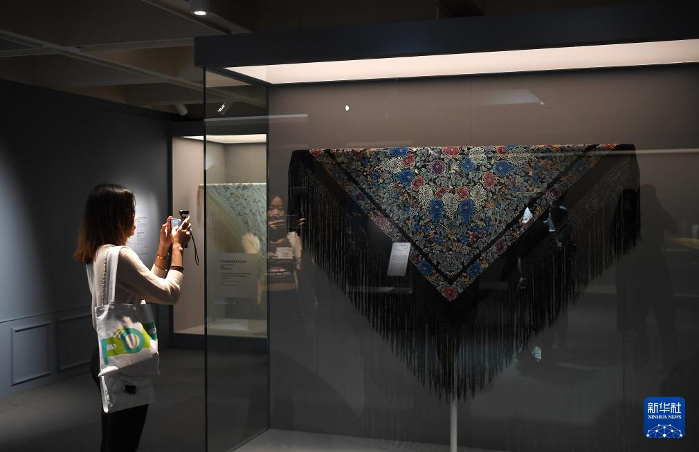 9月7日,媒体记者在展览上拍摄一款披肩。新华社记者 陈铎 摄