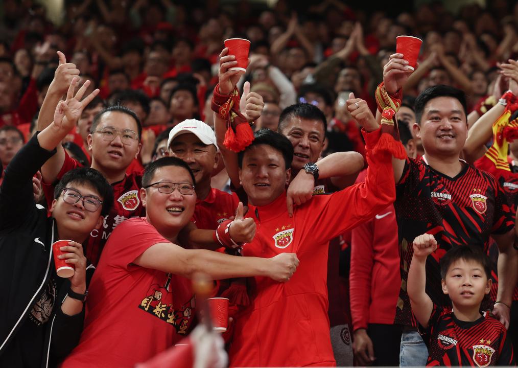 11月2日,上海海港队球迷庆祝本队得分。当日,在2024赛季中国足球协会超级联赛最后一轮比赛中,上海海港队主场5:0战胜天津津门虎队,卫冕中超联赛冠军。新华社记者 贾浩成 摄