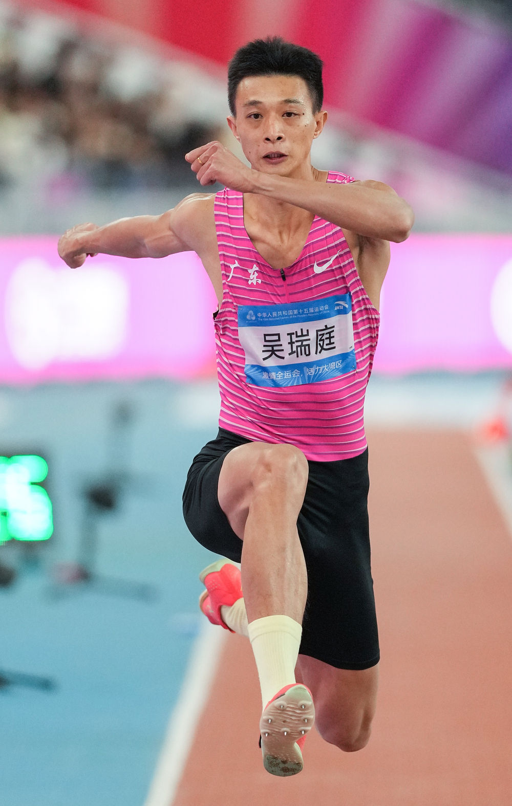 11月20日,广东队选手吴瑞庭在第十五届全国运动会田径项目男子三级跳远决赛中。他获得冠军。新华社记者 李一博 摄