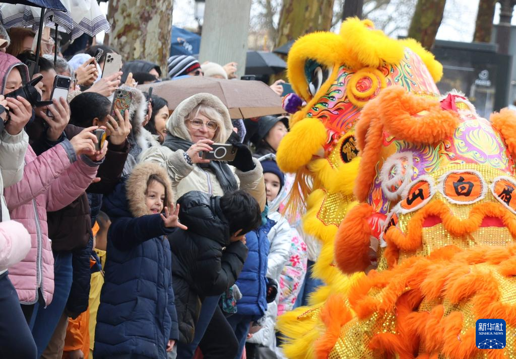 2月1日,在法国首都巴黎的香榭丽舍大街,人们观看巡游活动上的醒狮表演。新华社记者 张百慧 摄