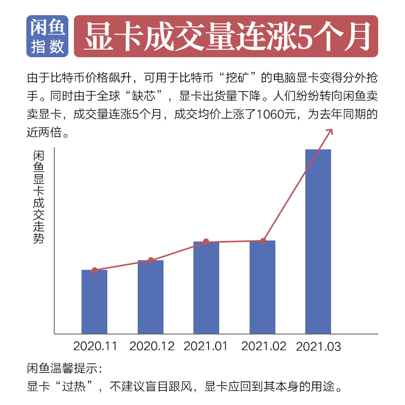 ????? 根據(jù)閑魚平臺數(shù)據(jù)顯示,顯卡成交呈現(xiàn)明顯的“量價(jià)齊升”現(xiàn)象。閑魚平臺上顯卡的成交量已經(jīng)連漲5個(gè)月,僅在今年第一季度,顯卡成交量同比增長了338%,3月份更是呈飆升走勢。對此,平臺將設(shè)置“冷靜期”進(jìn)行降溫處理,并呼吁用戶理性購買。