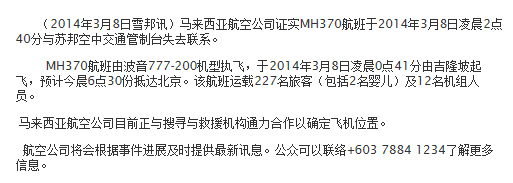 ????這份聲明標(biāo)記的時(shí)間為3月24日晚上10時(shí)15分。而在3月8日,馬航發(fā)表的聲明則表示“該航班運(yùn)載227名旅客(包括2名嬰兒)及12名機(jī)組人員?!?/p>