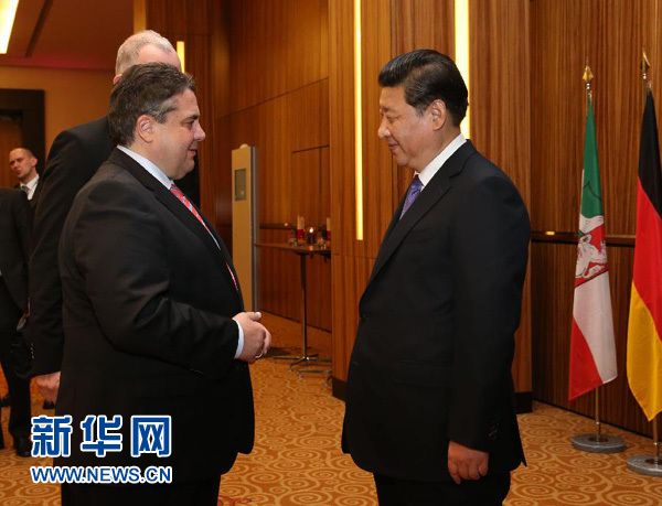 ??? 3月29日,國家主席習近平在杜塞爾多夫會見德國副總理兼經(jīng)濟和能源部長、德國社會民主黨主席加布里爾。 新華社記者劉衛(wèi)兵攝