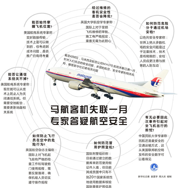 圖表:馬航客機(jī)失聯(lián)一月,專家答疑航空安全。 新華社記者 袁振宇 周大慶 編制