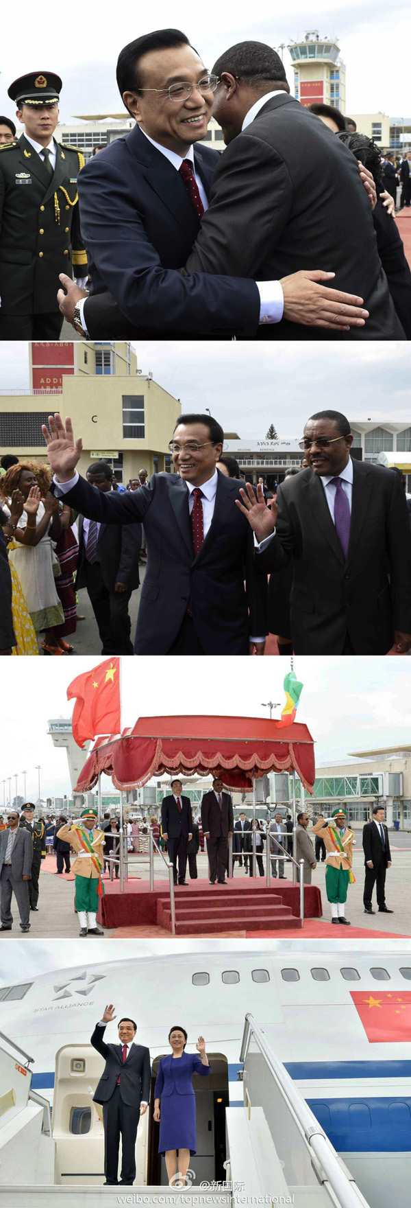 新華網(wǎng)北京5月7日電? 據(jù)新華社“新國(guó)際”微博報(bào)道,?當(dāng)?shù)貢r(shí)間6日下午,李克強(qiáng)總理結(jié)束對(duì)埃塞俄比亞和非盟總部的訪問(wèn),乘專機(jī)離開(kāi)亞的斯亞貝巴飛赴此訪非洲的第二站尼日利亞。埃塞總理海爾馬里亞姆和夫人到機(jī)場(chǎng)歡送,并舉行了歡送儀式。身著民族服裝的當(dāng)?shù)孛癖娸d歌載舞歡送中國(guó)貴賓。