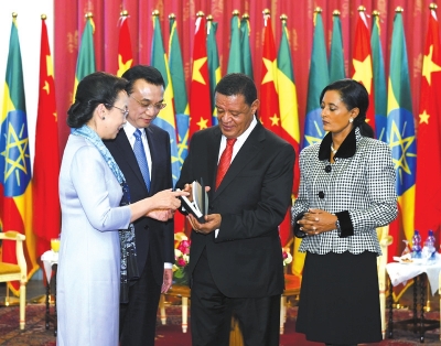 ▲李克強(qiáng)總理與夫人程虹當(dāng)?shù)貢r(shí)間6日上午同埃塞總統(tǒng)穆拉圖夫婦在國(guó)家宮會(huì)見。會(huì)見后,程虹將自己的著作和譯著贈(zèng)送給姆拉圖總統(tǒng)夫婦。圖/中國(guó)政府網(wǎng)