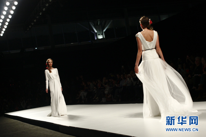 模特在T臺(tái)上展示西班牙品牌Victorio & Lucchino的婚紗。Victorio & Lucchino是來自西班牙塞維亞 (Sevilla)的兩位男服裝設(shè)計(jì)師的名字,Victorio和Lucchino同時(shí)也是西班牙本土知名時(shí)裝設(shè)計(jì)師組合之一。