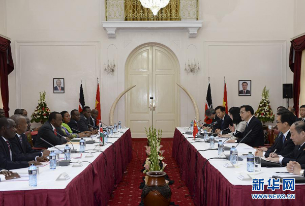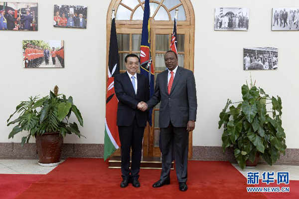 ????肯雅塔代表肯尼亞政府和人民熱烈歡迎李克強(qiáng)訪肯,表示在周恩來(lái)總理訪非50周年之際,李克強(qiáng)總理對(duì)非洲進(jìn)行的里程碑式訪問(wèn)取得圓滿成功,將進(jìn)一步深化非中新型戰(zhàn)略伙伴關(guān)系??现杏兄嗤臍v史遭遇和發(fā)展任務(wù),肯方感謝中方對(duì)肯經(jīng)濟(jì)社會(huì)發(fā)展和保護(hù)生態(tài)環(huán)境、野生動(dòng)物資源的幫助和支持,高度贊賞中國(guó)為維護(hù)非洲和平與發(fā)展作出的重要貢獻(xiàn),完全贊同李克強(qiáng)總理在非盟演講中提出的“461”非中合作框架和在世界經(jīng)濟(jì)論壇非洲峰會(huì)特別致辭中提出的合作建設(shè)非洲基礎(chǔ)設(shè)施“三大網(wǎng)絡(luò)”的主張,愿與中方加強(qiáng)戰(zhàn)略溝通,全面推進(jìn)各領(lǐng)域合作,實(shí)現(xiàn)共同發(fā)展??戏皆缸鲋袊?guó)企業(yè)進(jìn)入非洲的門戶,為推動(dòng)非中合作發(fā)揮積極作用。
