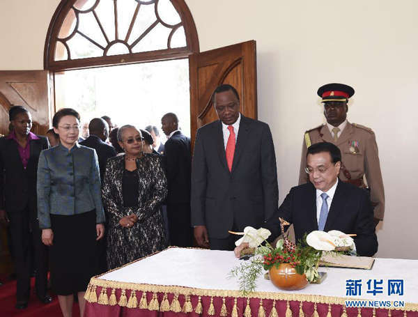 ??? 5月10日,中國(guó)國(guó)務(wù)院總理李克強(qiáng)在肯尼亞國(guó)家宮同肯總統(tǒng)肯雅塔舉行會(huì)談。這是會(huì)談開始前,李克強(qiáng)在貴賓簿上簽名。 新華社記者 李學(xué)仁 攝