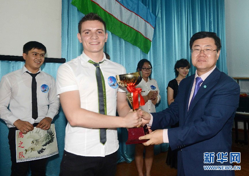 ????新華社塔什干6月9日電(記者沙達(dá)提)為慶祝中烏建交22周年,增進(jìn)兩國(guó)間了解與交流,由中國(guó)駐烏茲別克斯坦使館主辦、烏茲別克斯坦世界語(yǔ)言大學(xué)承辦、塔什干孔子學(xué)院協(xié)辦的“長(zhǎng)青杯”第一屆中烏知識(shí)競(jìng)賽9日在烏茲別克斯坦語(yǔ)言大學(xué)隆重舉行。中國(guó)駐烏茲別克斯坦大使孫立杰、烏世界語(yǔ)言大學(xué)校長(zhǎng)卡尤莫夫出席頒獎(jiǎng)儀式并致辭。