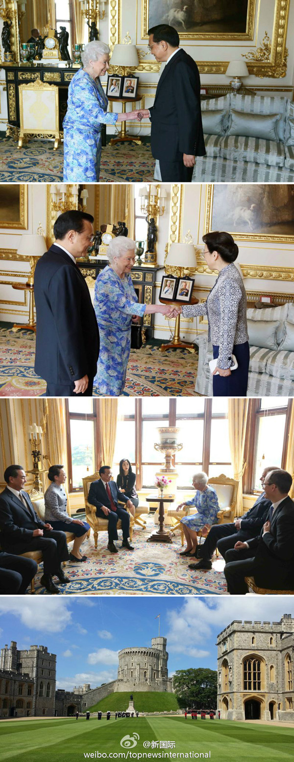 新華網(wǎng)北京6月17日電據(jù)新華社“新國際”微博報道,國務院總理李克強17日上午在溫莎宮會見英國女王伊麗莎白二世。