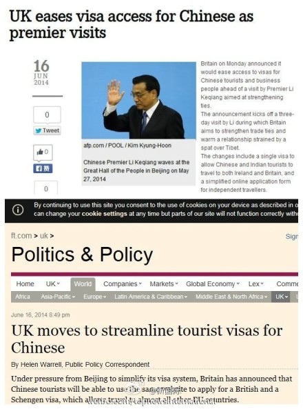 ????新華網(wǎng)北京6月17日電 據(jù)新華社“新國際”微博報道,李克強總理16日開始英國之行,英方當日宣布將放寬對中國游客和商務人士的簽證限制,簡化中國個人旅行者網(wǎng)簽申請程序,而且英國正與其他歐洲國家談判,希望允許中國旅行者通過單一程序申請英國和申根國家簽證。此前,簽證難辦一直困擾赴英中國民眾。