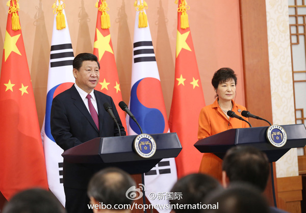 ??? 新華網(wǎng)北京7月4日電 據(jù)新華社“新國(guó)際”微博報(bào)道,習(xí)近平主席3日在同韓國(guó)總統(tǒng)樸槿惠會(huì)談后共見(jiàn)記者時(shí)說(shuō),我和樸槿惠總統(tǒng)都認(rèn)為,中韓兩國(guó)應(yīng)一道努力,成為實(shí)現(xiàn)共同發(fā)展的伙伴、致力地區(qū)和平的伙伴、攜手振興亞洲的伙伴、促進(jìn)世界繁榮的伙伴。