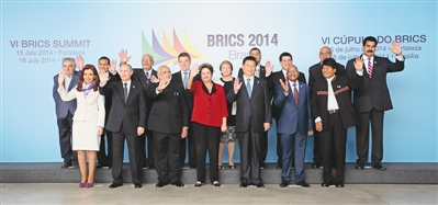 本報(bào)巴西利亞7月16日電?。ㄓ浾叨派袧?、丁剛)7月16日,金磚國家同南美國家領(lǐng)導(dǎo)人對話會(huì)在巴西利亞舉行。中國國家主席習(xí)近平、巴西總統(tǒng)羅塞夫、俄羅斯總統(tǒng)普京、印度總理莫迪、南非總統(tǒng)祖馬以及蘇里南總統(tǒng)鮑特塞、阿根廷總統(tǒng)克里斯蒂娜、玻利維亞總統(tǒng)莫拉萊斯、哥倫比亞總統(tǒng)桑托斯、智利總統(tǒng)巴切萊特、厄瓜多爾總統(tǒng)科雷亞、圭亞那總統(tǒng)拉莫塔爾、巴拉圭總統(tǒng)卡特斯、秘魯總統(tǒng)烏馬拉、烏拉圭總統(tǒng)穆???、委內(nèi)瑞拉總統(tǒng)馬杜羅等南美國家領(lǐng)導(dǎo)人共同出席。
