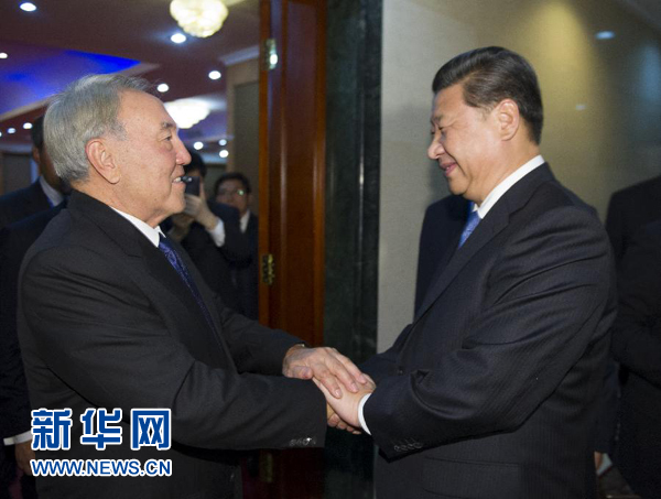 納扎爾巴耶夫表示,在習(xí)近平主席親自關(guān)切和推動下,哈中關(guān)系達(dá)到很高水平,高層交往順暢,戰(zhàn)略性合作富有成果。我們每次會面都是在坦誠、互信氣氛中進(jìn)行的。我珍惜同習(xí)近平主席的友誼,愿意同習(xí)近平主席繼續(xù)保持密切交往,共同推動兩國合作,使哈中關(guān)系成為地區(qū)國家關(guān)系的典范。哈方希望以共建絲綢之路經(jīng)濟(jì)帶為契機(jī),擴(kuò)大兩國能源、雙向投資、加工制造業(yè)、過境運(yùn)輸?shù)阮I(lǐng)域合作,建設(shè)好中亞-中國天然氣管道,提升雙邊及中亞國家和中國的經(jīng)貿(mào)合作水平。今年伊犁河流域出現(xiàn)旱情,中方克服困難,向哈方實(shí)施緊急調(diào)水,緩解了哈方境內(nèi)旱情,哈方表示感謝。