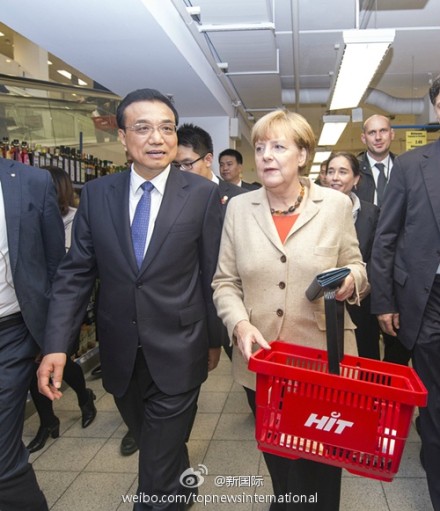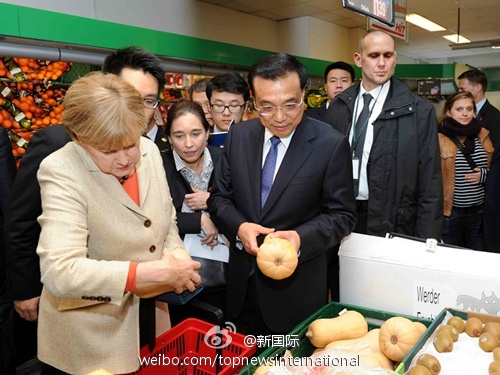 在超市的入口,默克爾拿起了一個提籃,轉(zhuǎn)頭對李克強總理說:“你不用拿了,我們用一個就行。”