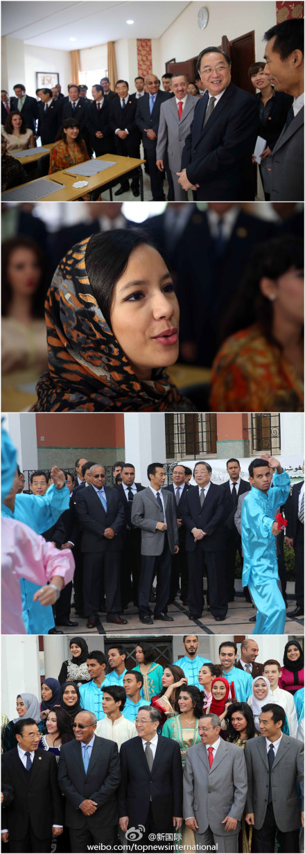 ??? 新華網(wǎng)北京11月6日電 據(jù)新華社“新國(guó)際”微博報(bào)道,全國(guó)政協(xié)主席俞正聲5日參觀摩洛哥穆罕默德五世大學(xué)孔子學(xué)院,身著摩中兩國(guó)民族服裝的當(dāng)?shù)貙W(xué)生誦唐詩(shī)、打太極、跳《小蘋果》歡迎。俞正聲走進(jìn)課堂對(duì)學(xué)生說:“你們是中摩友好的未來。希望大家用心學(xué)好中文,促進(jìn)合作交流?!?(記者李拯宇 攝影劉衛(wèi)兵)