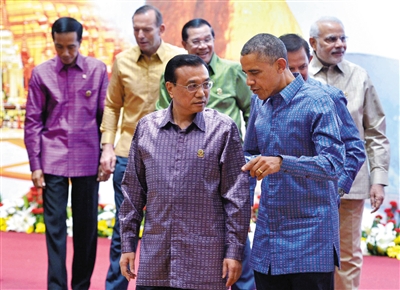 11月12日,李克強(qiáng)與奧巴馬在東亞峰會(huì)期間交談。