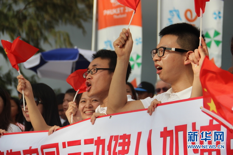 ??? 11月16日,普吉孔子學(xué)院的中國志愿者老師們?yōu)橹袊\(yùn)動(dòng)健兒加油。中國體育代表團(tuán)16日在泰國普吉舉行的第四屆亞洲沙灘運(yùn)動(dòng)會(huì)上勇奪2枚金牌和2枚銅牌。當(dāng)天比賽全部結(jié)束時(shí),中國隊(duì)以3金2銀5銅的成績暫列獎(jiǎng)牌榜第五,東道主泰國隊(duì)以9金11銀12銅的成績暫列金牌榜和獎(jiǎng)牌榜第一。新華社記者楊云燕攝