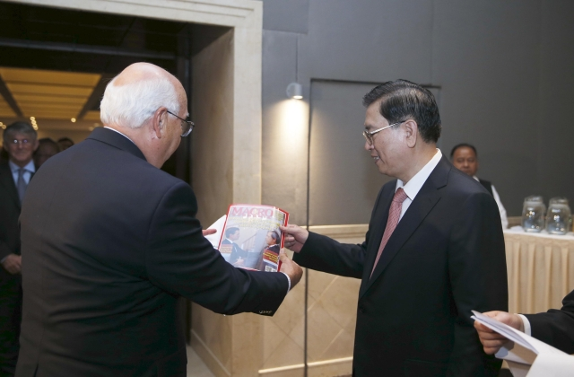 ??? 希門內斯將最新一期《宏觀經濟》送給張德江委員長。1972年希門內斯首次訪華,是時任墨西哥總統(tǒng)埃切維里亞的新聞官。他后來多次到中國參觀考察,親眼目睹了中國的巨大變化。他說原來的北京是個“矮城”,樓不高,車輛少,步行的人多。現(xiàn)在的北京“已成為高樓林立的現(xiàn)代化大都市”。
