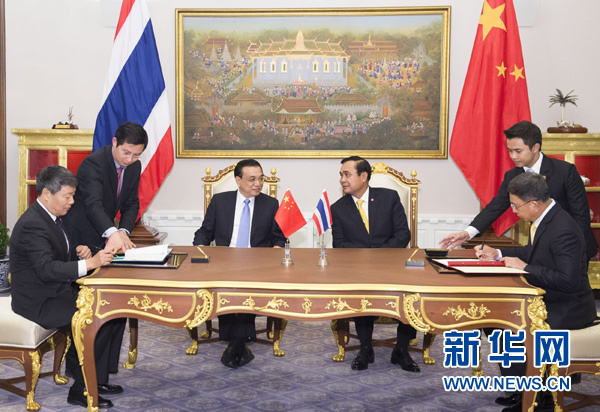 ????12月19日,國(guó)務(wù)院總理李克強(qiáng)在曼谷會(huì)見(jiàn)泰國(guó)總理巴育。這是會(huì)見(jiàn)后,兩國(guó)總理共同見(jiàn)證《中泰鐵路合作諒解備忘錄》和《中泰農(nóng)產(chǎn)品貿(mào)易合作諒解備忘錄》的簽署。新華社記者黃敬文攝