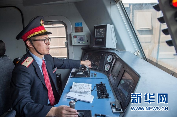 10月15日,第1000列中歐班列開行前,重慶機務(wù)段執(zhí)行本次班列駕駛?cè)蝿?wù)的司機王銘杰在駕駛室內(nèi)進(jìn)行開行前的操作。當(dāng)日11時45分,載著筆記本電腦等51個集裝箱貨物的中歐班列,緩緩駛出重慶團結(jié)村站,駛向1.1萬公里之外的德國杜伊斯堡。這是第1000列往來中國和歐洲之間的國際貨運列車。新華社記者劉潺攝