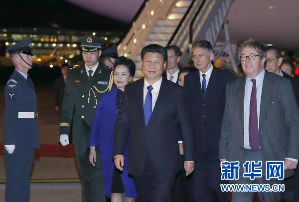 10月19日,國家主席習(xí)近平抵達(dá)倫敦,開始對(duì)英國進(jìn)行國事訪問。英國女王代表胡德子爵、外交大臣哈蒙德等到機(jī)場迎接習(xí)近平和夫人彭麗媛。新華社記者 鞠鵬 攝
