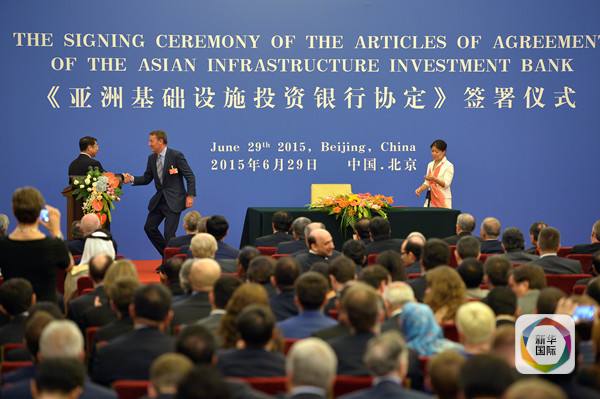 ????2015年6月29日,《亞洲基礎設施投資銀行協(xié)定》簽署儀式在北京舉行。當日,英國授權代表(臺上中)在簽署《協(xié)定》后與儀式主持、財政部副部長史耀斌握手。