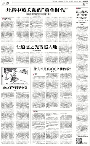 英國駐華大使吳百納連續(xù)用了四個“黃金”來形容習(xí)近平主席此次訪英的意義:“今年是中英關(guān)系的黃金年,這將是一次黃金訪問,它證明中英關(guān)系的發(fā)展處于黃金時期。訪問將確立中英面向21世紀(jì)的全球伙伴關(guān)系,開啟中英關(guān)系史上的黃金10年?!蔽覀兤诖⑾嘈?,這次為開啟中英關(guān)系“黃金時代”而往的里程碑式訪問,一定能成功打造中英關(guān)系新格局、繪制兩國關(guān)系新藍(lán)圖、開辟務(wù)實(shí)合作新前景、樹立國際合作新典范。(南方日報評論員)