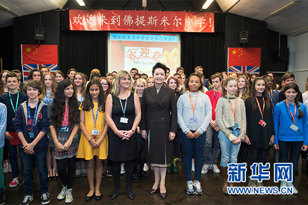 ??? 10月21日,國家主席習近平夫人彭麗媛在倫敦參觀福提斯米爾中學。這是彭麗媛同該校學生互動。 新華社記者 謝環(huán)馳 攝