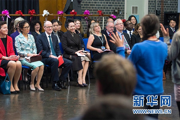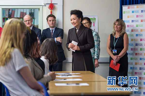 在英國教育部國務(wù)大臣吉布、學校校長等陪同下,彭麗媛觀看學生們用中文進行的才藝表演,參觀學校成果展,觀摩中文課,與女學生們互動交流,并向?qū)W校贈送中國文化及漢語學習類圖書及音像制品。