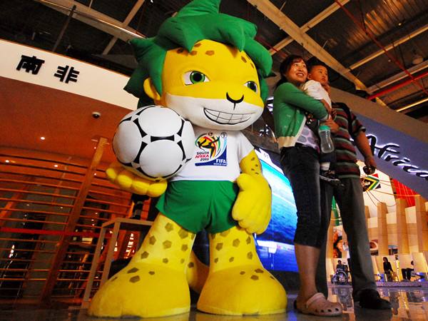 2010年5月7日,游客在世博園南非館與世界杯吉祥物“扎庫米”合影。