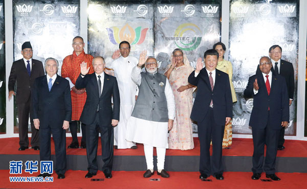 ??? 10月16日,金磚國家領(lǐng)導(dǎo)人同“環(huán)孟加拉灣多領(lǐng)域經(jīng)濟(jì)技術(shù)合作倡議”成員國領(lǐng)導(dǎo)人對話會在印度果阿舉行。國家主席習(xí)近平同印度總理莫迪、南非總統(tǒng)祖馬、巴西總統(tǒng)特梅爾、俄羅斯總統(tǒng)普京以及斯里蘭卡總統(tǒng)西里塞納、孟加拉國總理哈西娜、不丹首相托杰、尼泊爾總理普拉昌達(dá)、緬甸國務(wù)資政昂山素季、泰國政府代表等共同出席。新華社記者丁林?jǐn)z