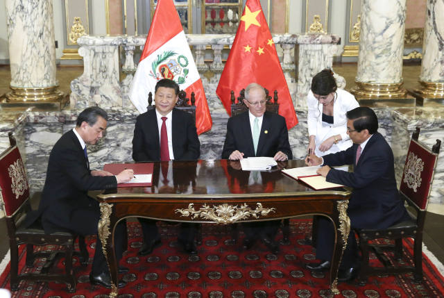 11月21日,國(guó)家主席習(xí)近平在利馬同秘魯總統(tǒng)庫琴斯基舉行會(huì)談。會(huì)談后,兩國(guó)元首見證《中華人民共和國(guó)政府與秘魯共和國(guó)政府2016年至2021年共同行動(dòng)計(jì)劃》等文件的簽署。(新華社記者 龐興雷 攝)
