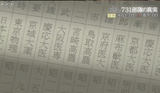 參加731部隊的機構(gòu)及人員名單(圖片來源:NHK視頻截圖)