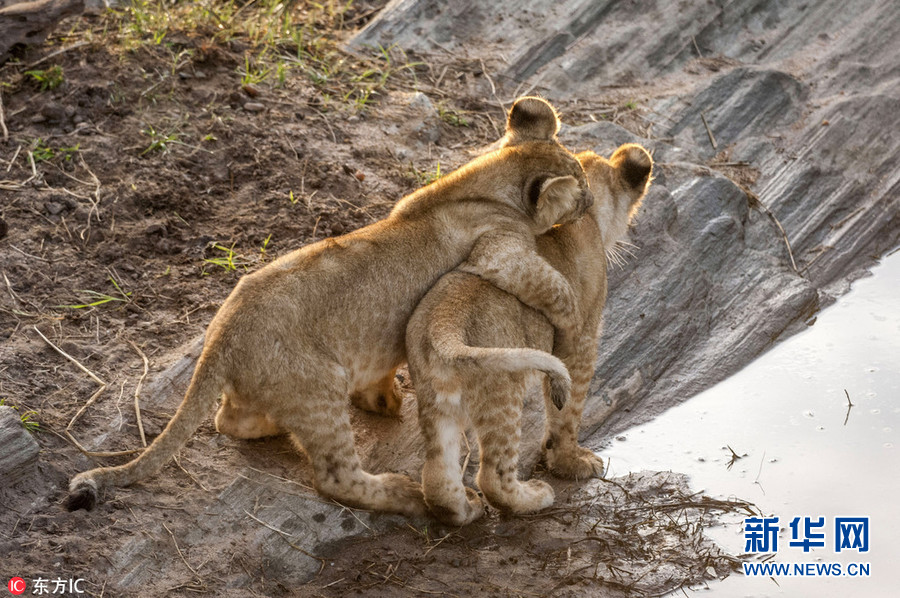 1月2日報道(具體拍攝時間不詳),肯尼亞馬賽馬拉國家保護(hù)區(qū),64歲的攝影師Ingo Gelach在當(dāng)?shù)嘏臄z到一組有趣又暖心的照片。畫面中,兩頭小獅子站在水邊,似乎正考慮跨越面前的水域。其中一頭獅子用前腳搭在同伴的肩膀上,似乎在表達(dá)友好,又似是在鼓勵同伴不要害怕,勇敢地跨過去。(圖片來源:東方IC)