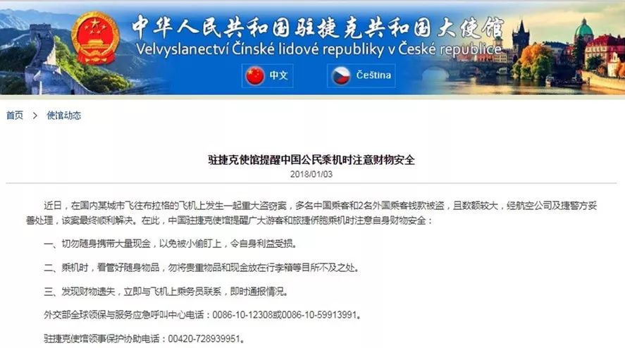中國(guó)駐捷克使館提醒廣大游客和旅捷僑胞乘機(jī)時(shí)注意自身財(cái)物安全: