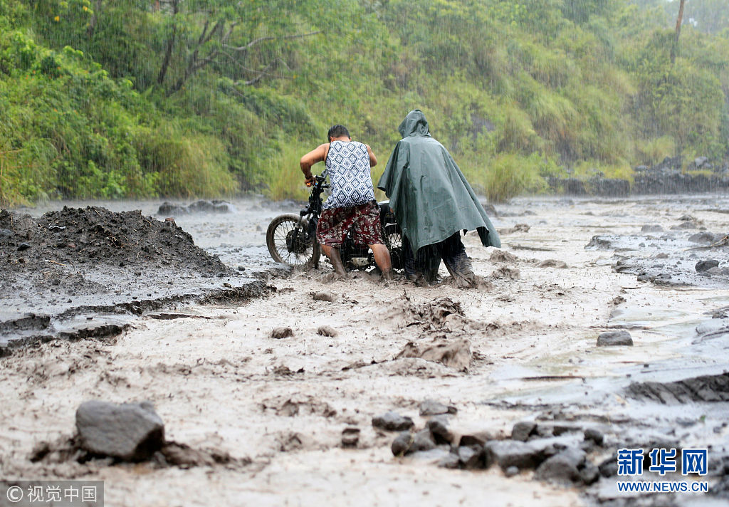 當(dāng)?shù)貢r(shí)間2018年1月27日,菲律賓阿爾拜省,民眾穿過混合著火山灰的泥漿河。(圖片來源:視覺中國)