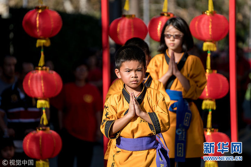 當(dāng)?shù)貢r(shí)間1月28日,美國洛杉磯,當(dāng)?shù)谿rove商場舉行少林武術(shù)表演以及其他中國文化類的演出,慶祝傳統(tǒng)新年,場外攤位還有傳統(tǒng)剪紙,捏面人,糖畫,彩繪等項(xiàng)目。圖為少林功夫表演。(圖片來源:視覺中國)