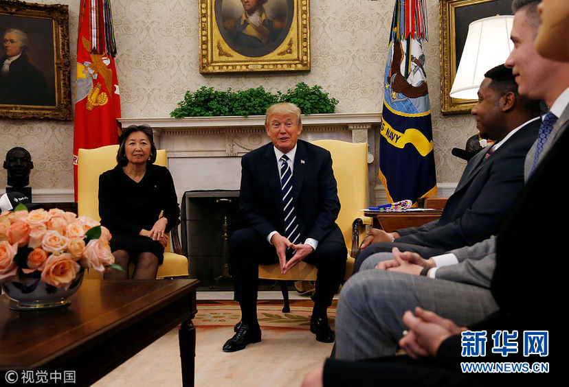 美國總統(tǒng)特朗普與公司職員討論稅改 獲贈一雙花襪子